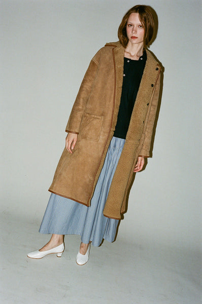Cawley Sheepskin Suede Curly Roo Coat in Tan