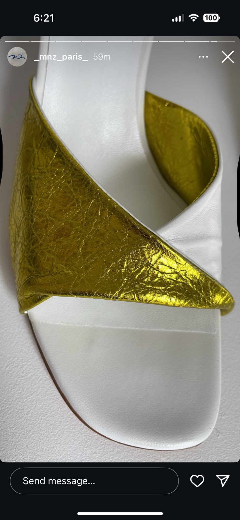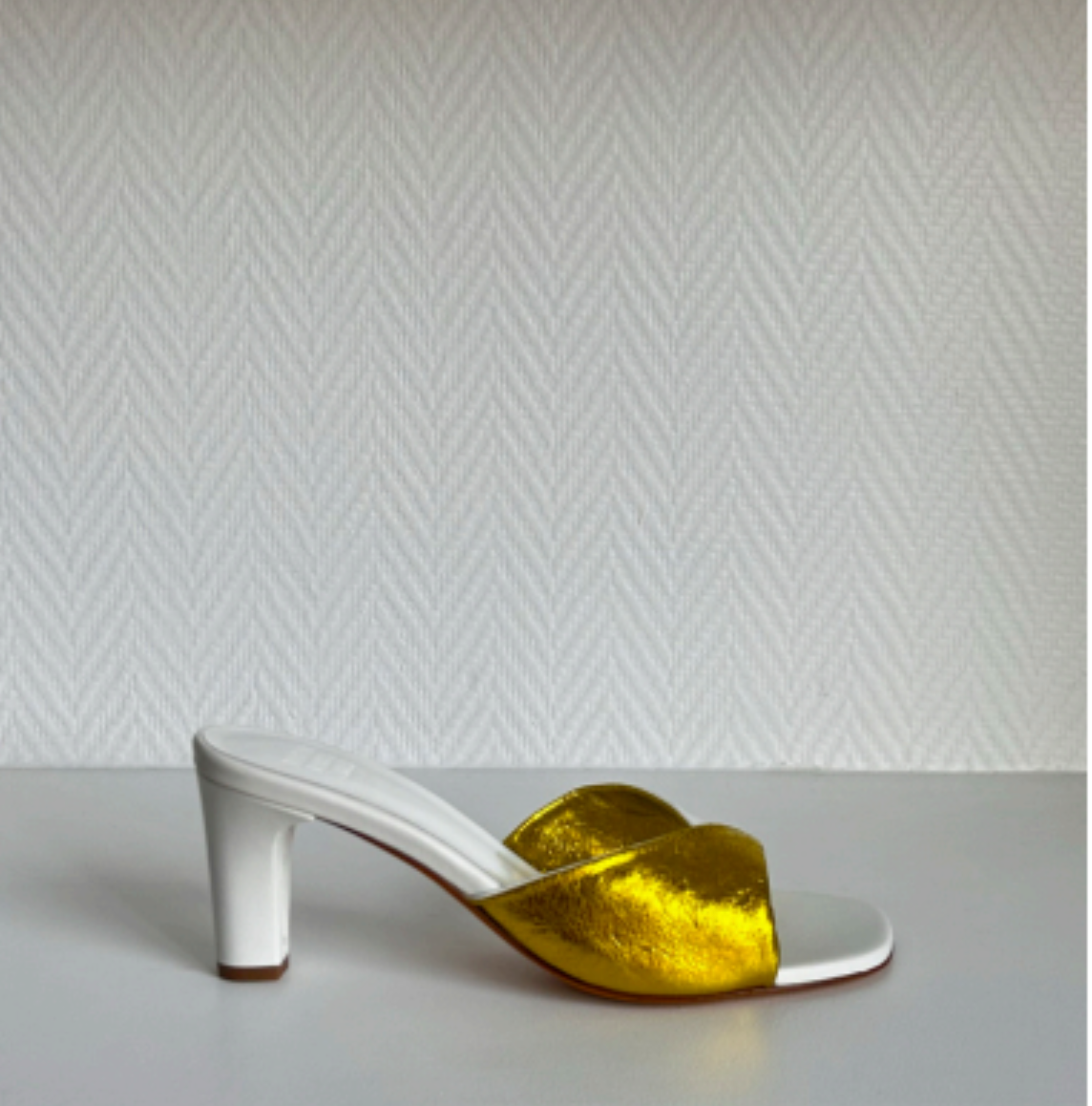 - A sleek, open-toe slide silhouette with a metallic goldfinch accent and a 9.5cm heel.