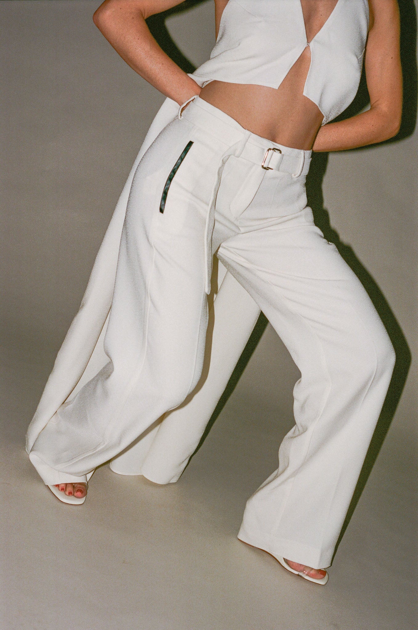 - Basil Suit Trousers have a relaxed tailored fit, sit low waist with a straight leg. Folded front leg pleat, side pockets, and belt loopholes. Featuring black leather binding detailing.