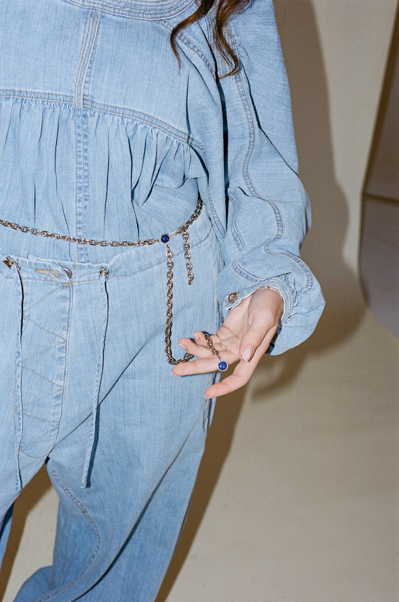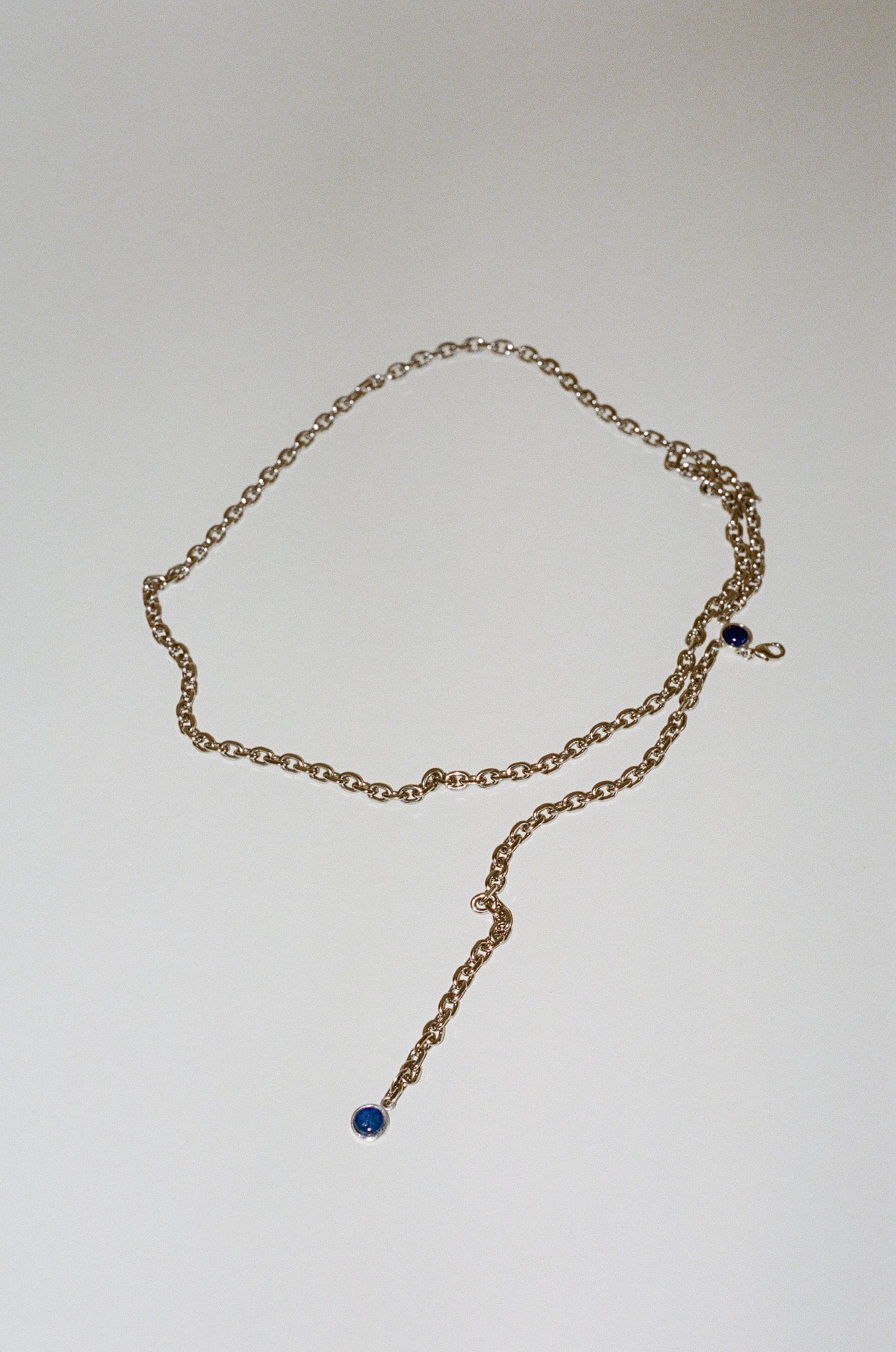 - Minimalist chain belt with a lobster closure and two round lapis lazuli - one at the waist, one on the drop. Sits at the hip.